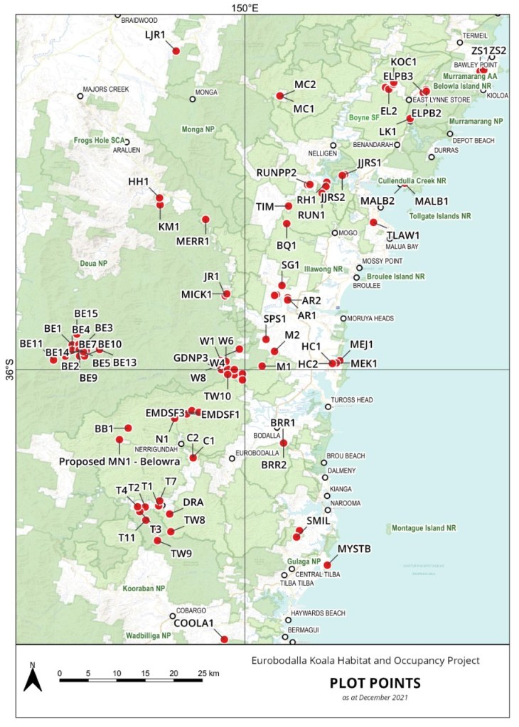This is the full plot points map, as of December 2021, of all the koala habitat surveys done by our volunteers since the Eurobodalla Koala Project began fieldwork in 2012.