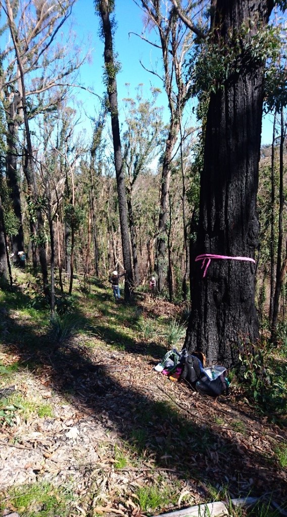 Although the grant was made beforehand, the severe fires of the 2019-2020 summer made this work all the more important, firstly as a contribution to the economic and social recovery of the Eurobodalla, and secondly for the scientific purpose of ascertaining the fires’ impact on the suitability of the project’s use of the Regularised Grid Based Spot Assessment Technique (RGBSAT) for individual plot analysis. Estimating the survival and recovery of the habitat patch also became relevant. These catastrophic fires burned at high-to-very high intensity across most of the study patch, with the remaining quarter experiencing low-to-medium intensity fire.